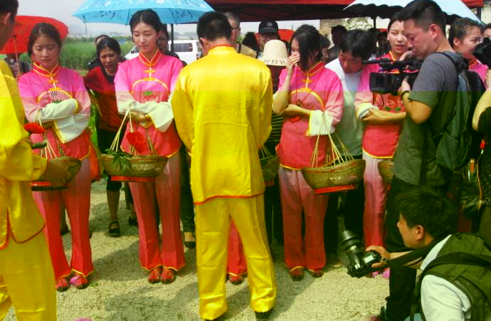 一開始,范姓未婚男青年家庭事先以五谷(米、麥、豆、高梁、粟)做成頭杵若干,之后,前來參與游戲的鄰村未婚女青年在祠堂管理員處領(lǐng)取花籃一個。一應(yīng)準備停當,接下來就是投杵,未婚男青年將頭杵投入自己鐘情對象手中的花籃中,每次一枚,可反復(fù)投遞,到了決勝的時刻,獲得頭杵最多的姑娘由范姓族中長輩戴上象征榮耀的花環(huán),所有未婚女青年則可以在自己花籃里投過頭杵的男青年中選擇自己的意中人。