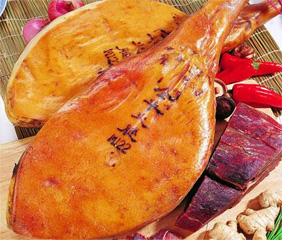 金華火腿又稱火朣,浙江金華漢族傳統(tǒng)名產(chǎn)之一。具有俏麗的外形,鮮艷的肉,獨(dú)特的芳香,悅?cè)说娘L(fēng)味,即色、香、味、形,"四絕"而著稱于世,清時(shí)由浙江省內(nèi)閣學(xué)士謝墉引入北京,已被列為貢品,謝墉的《食味雜詠》中提到: "金華人家多種田、釀酒、育豕。每飯熟,必先漉汁和糟飼豬,豬食糟肥美。造火腿者需豬多,可得善價(jià)。故養(yǎng)豬人家更多。"為中國腌臘肉制品中的精華。金華出產(chǎn)的"兩頭烏"豬,后腿肥大、肉嫩,經(jīng)過上鹽、整形、翻腿、洗曬、風(fēng)干等程序,數(shù)月乃成。香味濃烈。便于貯存和攜帶,已暢銷國內(nèi)外。