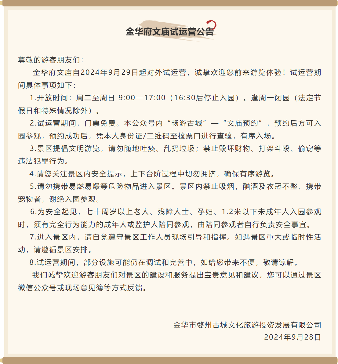 金華府文廟試運營公告