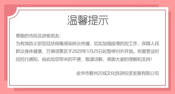 尊敬的市民及游客朋友:為有效防止新型冠狀病毒感染肺炎傳播,切實(shí)加強(qiáng)疫情防控工作,保障人民群眾身體健康,萬(wàn)佛塔景區(qū)于2020年1月25日起暫停對(duì)外開(kāi)放?;謴?fù)營(yíng)業(yè)時(shí)間另行通知,由此給您帶來(lái)的不便,敬請(qǐng)諒解,感謝大家的理解和支持!金華市婺州古城文化旅游投資發(fā)展有限公司