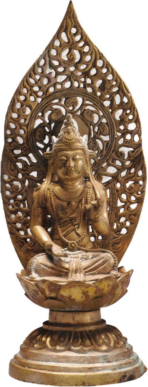 吳越國(907-978)金華萬佛塔地宮出土高16厘米浙江省博物館藏此像面相豐圓,梳高發(fā)髻,戴花冠,冠帶于耳后打結(jié)下垂至肩。上身袒露,左肩斜披絡(luò)腋,頸飾項圈,胸掛交叉穿璧式長瓔珞,垂于兩膝上。下體著裙。左手置膝上托凈瓶,右手上舉施印,結(jié)跚趺坐于仰覆蓮座上。