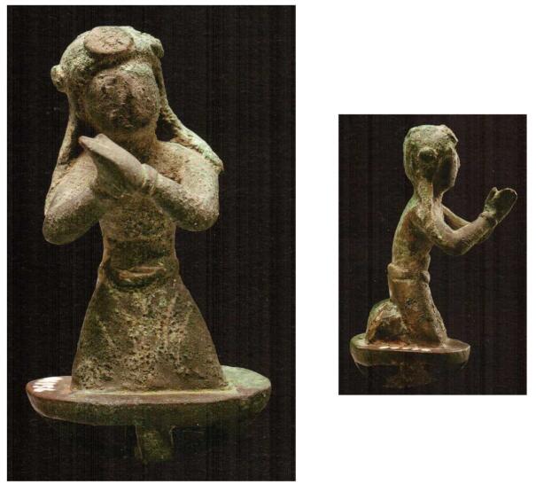 吳越國(907—978)金華萬佛塔地宮岀土通高8厘米浙江省博物館藏此像為童子像,頭梳雙髻,發(fā)盤于腦兩側(cè),耳后發(fā)辮垂于兩肩,頭微右側(cè),面部模糊,口鼻隱約可見。雙手合十右傾,腰系帶,曲膝跪于座上。