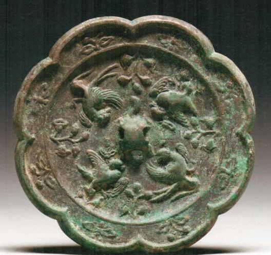 北宋(960—1127)金華萬佛塔地宮岀土直徑12.6厘米浙江省博物館藏鏡八瓣菱花形,獸形鈕,內(nèi)切圓形,鈕外四禽鳥四折枝花相間環(huán)繞。兩鵲展翅飛翔,拖著長尾,兩雁雙腳站立,羽翼微張,邊緣飾展翅蜂蝶與折枝花相間排列。