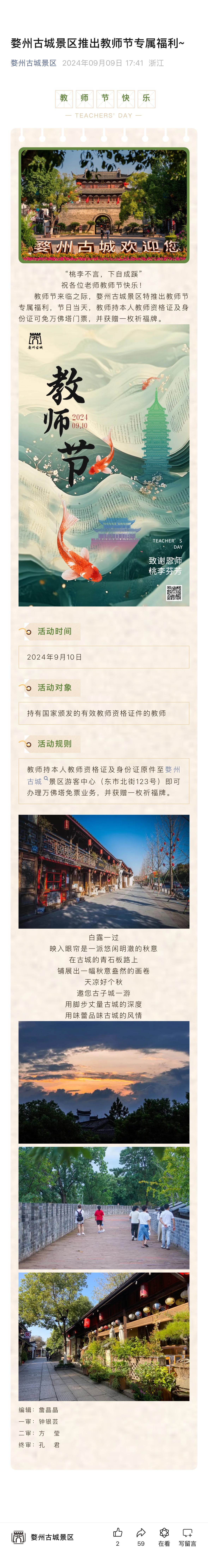 婺州古城景區(qū)推出教師節(jié)專屬福利~