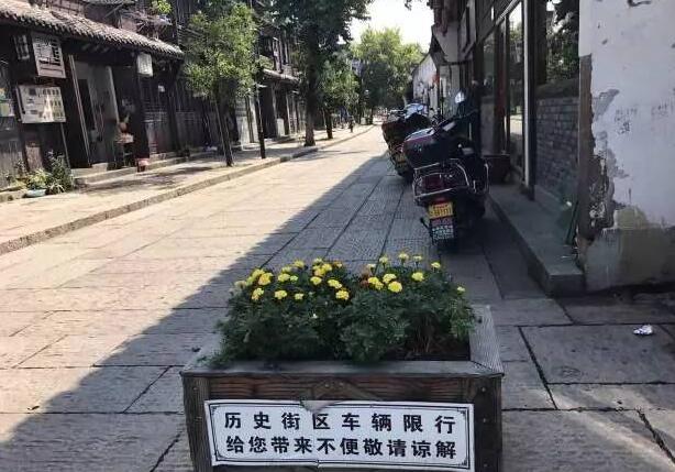 記者注意到,景區(qū)內(nèi)主要的歷史街區(qū)八詠街西側(cè)入口,有兩個(gè)綠化樁子攔著,上面張貼著“歷史街區(qū) 車(chē)輛限行”的標(biāo)語(yǔ),可這并沒(méi)有起到作用。街區(qū)上仍能看到五六輛汽車(chē)??吭谝慌?,電瓶車(chē)歪斜地停放著,有礙觀瞻。
