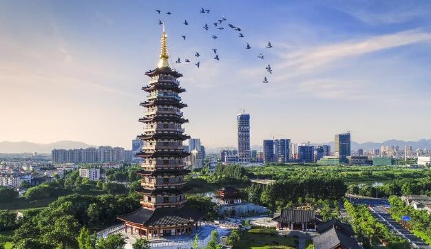 萬(wàn)佛塔,始建于北宋嘉佑七年(1062)至治平元年(1064)之間。因塔身外壁上半部的每塊磚上雕有不同的精美如來(lái)佛像,一排排地結(jié)跏趺坐在蓮臺(tái)上,數(shù)以萬(wàn)計(jì),故稱(chēng)“萬(wàn)佛塔”。由于建造時(shí)間早,塔身層次多,規(guī)模高大,雕飾華麗,譽(yù)滿東南,素有‘浙江第一塔’之稱(chēng)。抗戰(zhàn)期間,萬(wàn)佛塔不幸被拆,2014年啟動(dòng)復(fù)建,2019年12月31日正式對(duì)外開(kāi)放。新萬(wàn)佛塔高99.99米,采用明暗樓層相間結(jié)構(gòu),其工藝精妙,設(shè)計(jì)考究,是金華當(dāng)之無(wú)愧的城市地標(biāo)、文化地標(biāo)。