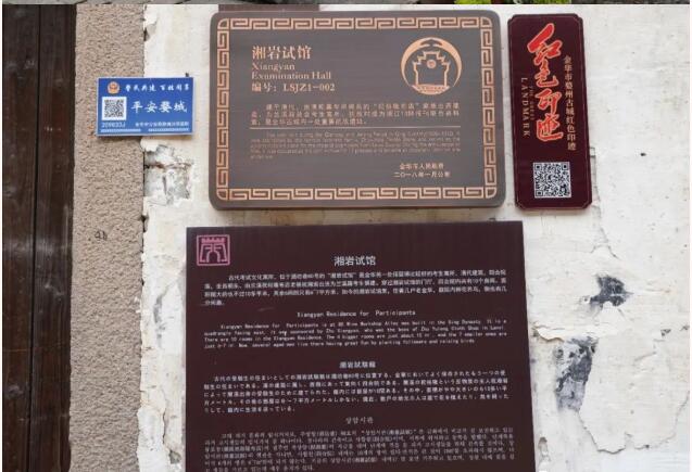 酒坊巷北段古稱太史第(又名“太師第”)。數(shù)百年來,這條小巷文脈興盛,名人輩出,聚居著不少名門望族。北宋名臣潘良貴、南宋宰相葉衡、清代治河官朱之錫都曾在此居住。酒坊巷內(nèi)考試讀書地最具有代表性的是南段的湘巖試館及北段的吳家試館,其完整展現(xiàn)了金華古代科舉文化風(fēng)范。
